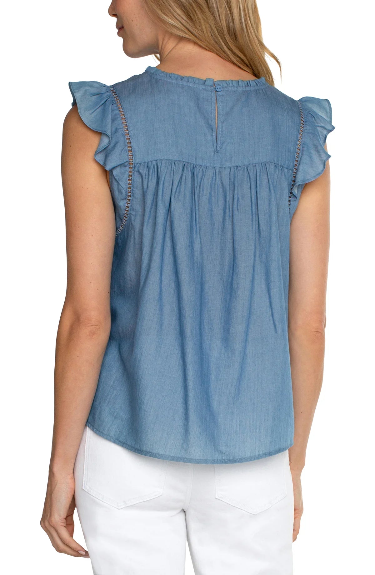 This elegant woven top featuring flutter sleeves and a subtle eyelet trim detail is ideal for the perfect evening look. Pair it with white denim shorts for a easy sunny day look!