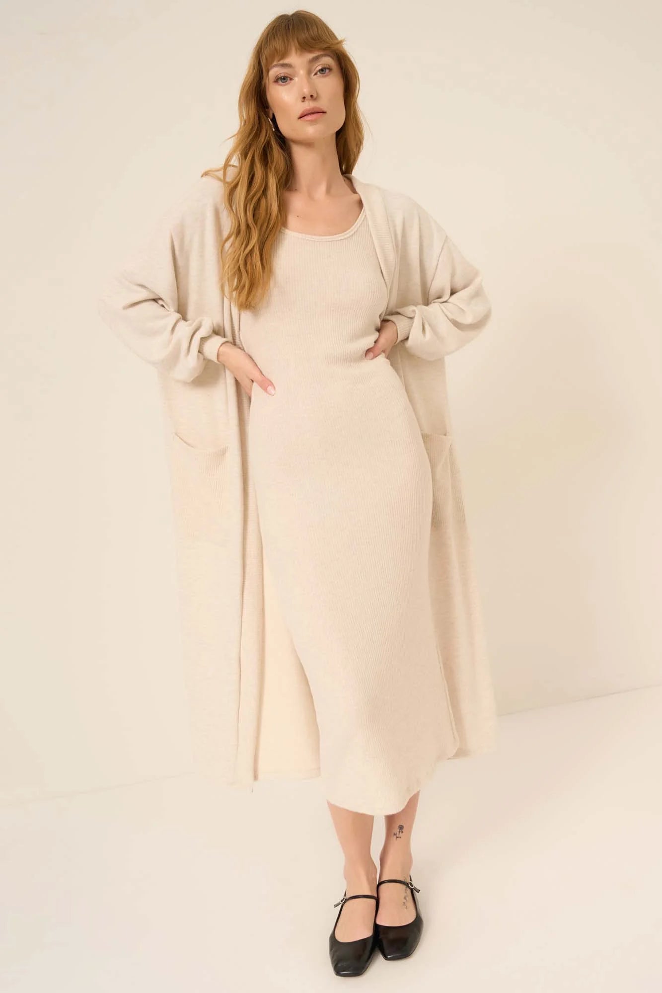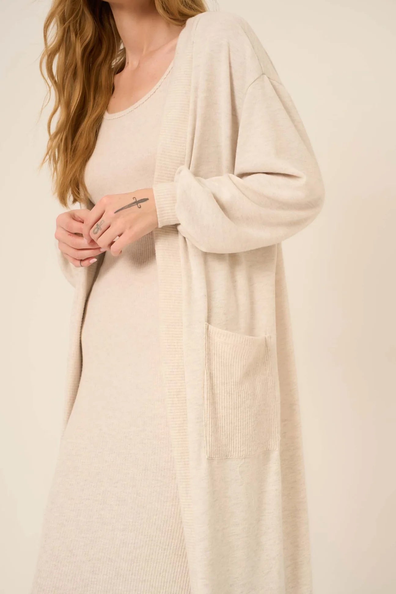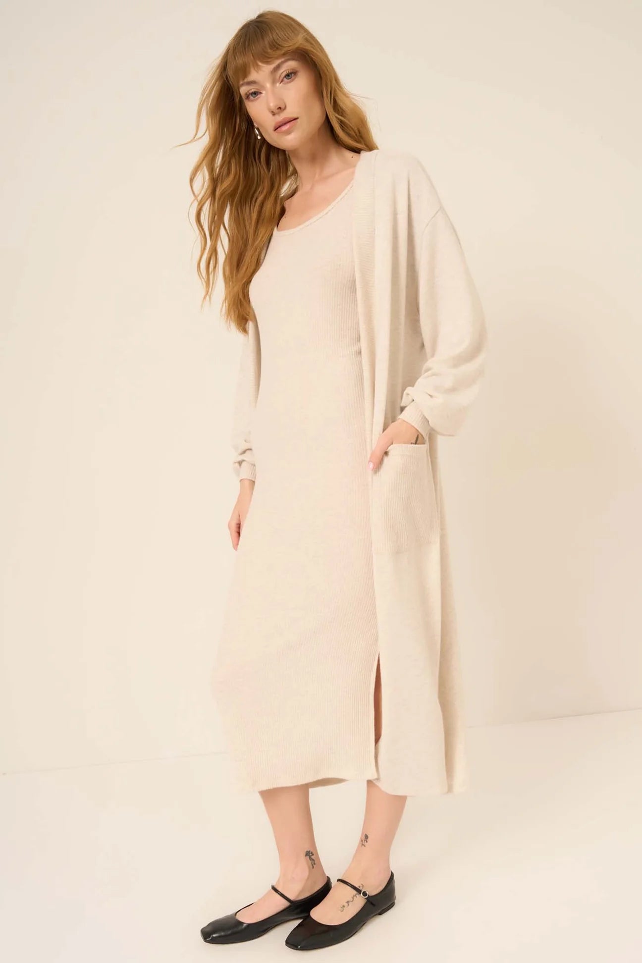 The On My Way Oatmeal Brushed Cardi is a long cardigan designed for both coziness and style. Crafted from soft brushed fabric with ribbed trim, this open-front cardi features pockets for added functionality. Perfect for draping over the On My Way Oatmeal Brushed Rib Dress, it’s your go-to layer for chilly days or casual outings that call for a touch of warmth.