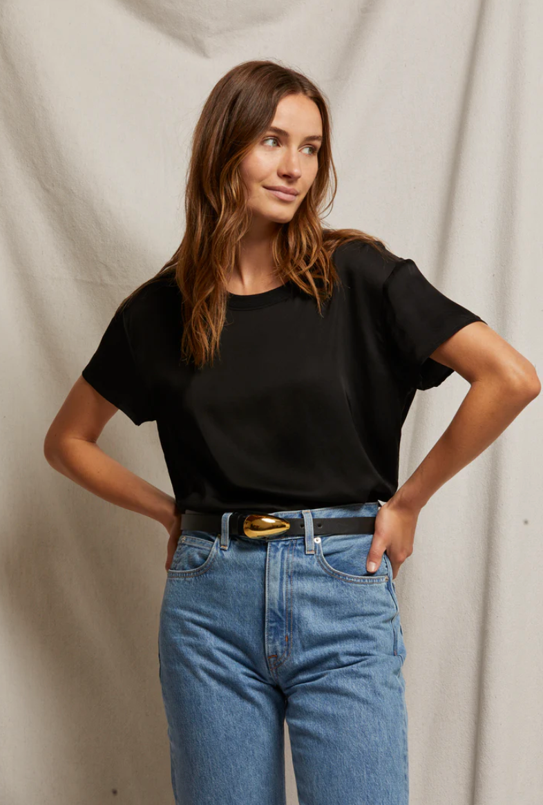 not just a tee. meet delphine; a classic crewneck tee shirt cut in whisper soft satin. just what you’ve been wanting this holiday.