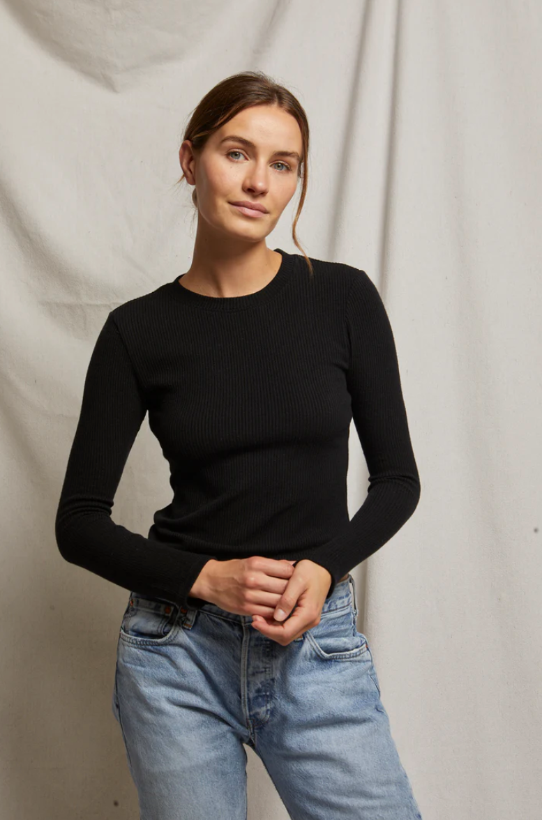 a classic long sleeve silhouette cut; the jolie features a crew neckline and full length sleeves in a soft loose knit sweater rib.